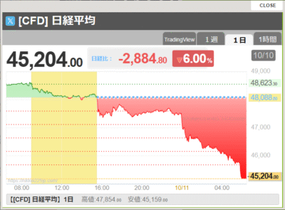 そしたら金曜日には自公連立解消ということで日経先物が500円安。それだけで済むかと思ったら朝起きてびっくり。
