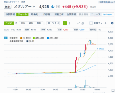 YH更新に貢献したのは、保有比率トップのメタルアート(5644)。木曜日の15時ころに何のニュースも無いまま10%の急騰。